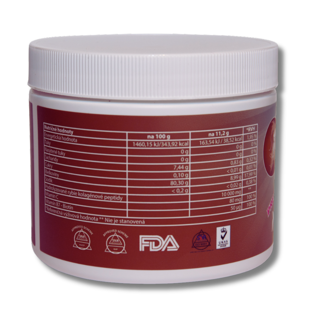 Tento mořský kolagen je ochucen červenou malinou v přirozené formě a pro vyšší účinek a lepší vstřebatelnost obsahuje vitamín C a D-biotin.